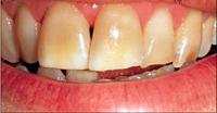 歯と歯ぐきの間の詰め物が古くなり、変色しています。また、歯と詰め物の間の隙間が虫歯になりかけています。