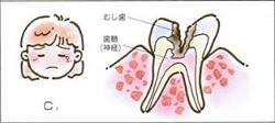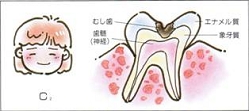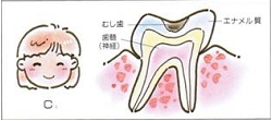 虫歯がエナメル質を越えて像画質に広がると、冷たいものや、甘いものがしみます。このころまでは治療もわりと早くすみます。虫歯が神経(歯髄)まで達する前に治療を受けてください。