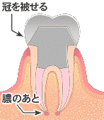 歯の先が化膿して、歯根膜炎を併発していれば、噛んだときに痛く根の先にウミの袋ができていることも多いです。抜歯をすることもあり、治療は困難となります。 神経の孔を通して顎の骨に最近が感染しますと顔が大きく腫れて骨膜炎を起こすことがあります。