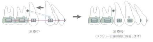 小さなスクリューを歯ぐきに入れ、これを引っ張る土台(固定源)にして歯を動かします。今までの方法と違って休みなく引っ張り続けるので、治療期間が短くなり、より確実で精度の高い治療結果を得ることができる方法です。